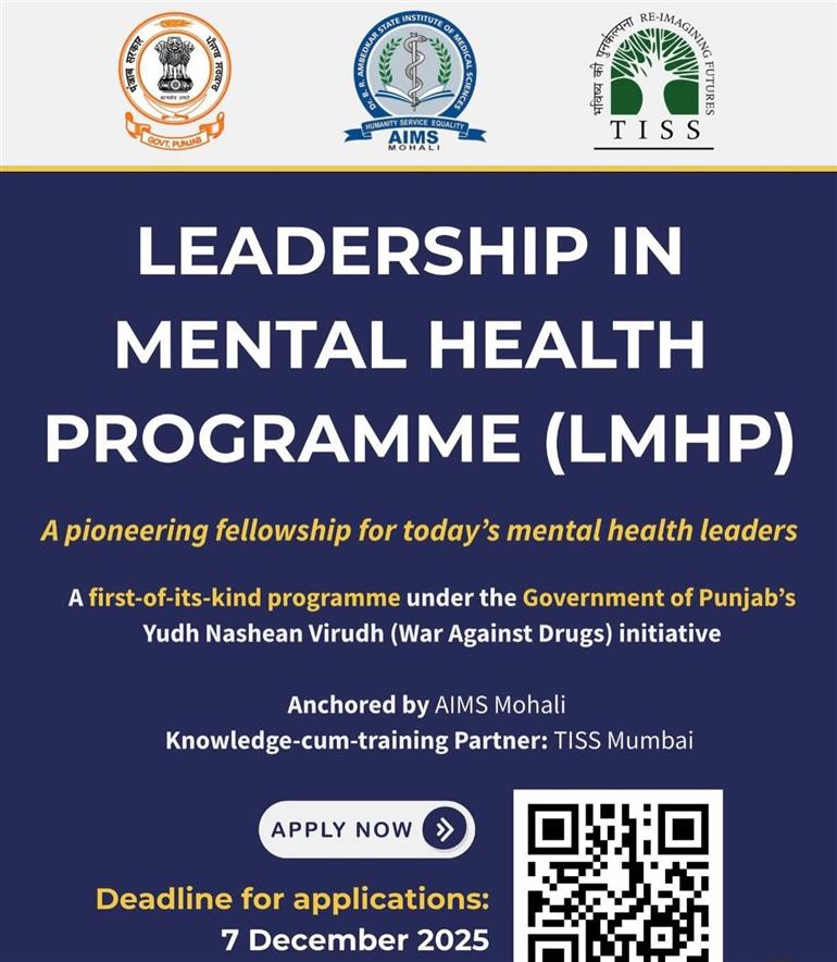 पंजाब सरकार (Punjab Government) ने देश में पहली बार ‘लीडरशिप इन मेंटल हेल्थ प्रोग्राम’ लॉन्च किया है, जो दो साल की फेलोशिप होगी। इसके लिए पंजाब सरकार ने एम्स मोहाली और टाटा इंस्टीट्यूट ऑफ सोशल साइंसेज (TISS) मुंबई के साथ साझेदारी की है। इस प्रोग्राम के तहत 35 युवाओं को चुना जाएगा, जो पंजाब के 23 जिलों में मानसिक स्वास्थ्य और नशा मुक्ति से जुड़े काम की जिम्मेदारी संभालेंगे। यह मॉडल पूरे देश के लिए एक आदर्श बनने जा रहा है।