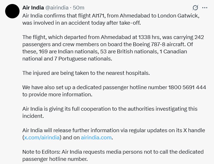 एयर इंडिया (Air India) ने हादसे के बाद एक हेल्पलाइन नंबर (1800-5691-444) जारी किया है। प्रवक्ता ने X पर बयान जारी कर कहा, ‘हम हादसे में हुए नुकसान का आकलन कर रहे हैं और जल्द ही http://airindia.com और https://x.com/airindia पर और जानकारी साझा करेंगे।’