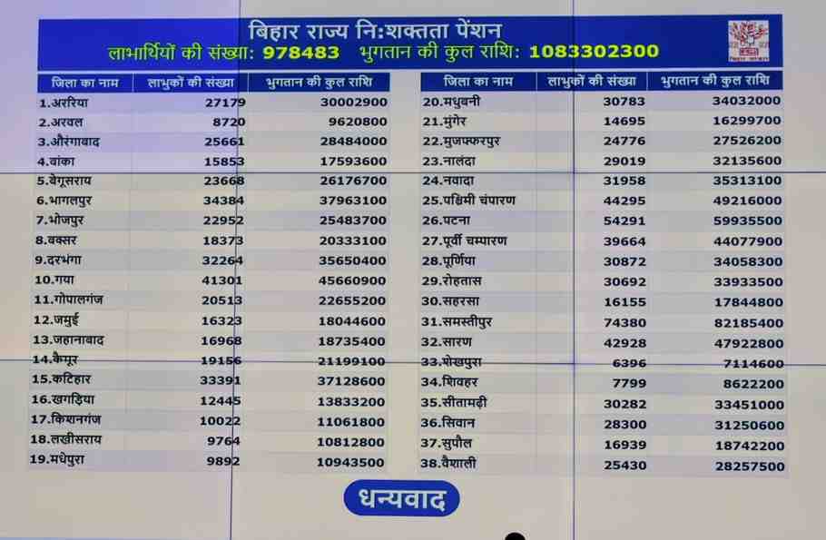 ज्ञातव्य है कि आज 06 सामाजिक सुरक्षा पेंशन के लाभार्थियों के खाते में राशि अंतरित की गई। इंदिरा गांधी राष्ट्रीय वृद्धावस्था पेंशन योजना के अंतर्गत पेंशनधारियों की संख्या 35,38,296 है, जिनके खाते में आज कुल 389 करोड़ 30 लाख 96 हजार रूपये की राशि अंतरित की गयी है। मुख्यमंत्री वृद्धजन पेंशन योजना के तहत पेंशनधारियों की संख्या 51,98,211 है, जिनके खाते में आज 585 करोड़ 86 लाख 97 हजार 900 रूपये की राशि अंतरित की गयी है। इन्दिरा गाँधी राष्ट्रीय विधवा पेंशन योजना के अंतर्गत पेंशनधारियों की संख्या 6,35,719 है, जिनके खाते में आज 70 करोड़ 31 लाख 93 हजार 100 रूपये की राशि अंतरित की गयी है। इंदिरा गांधी राष्ट्रीय निःशक्तता पेंशन योजना के अन्तर्गत पेंशनधारियों की संख्या 1,10,319 है, जिनके खाते में आज 12 करोड़ 13 लाख 79 हजार 700 रूपये की राशि अंतरित की गयी है। लक्ष्मीबाई सामाजिक सुरक्षा पेंशन योजना के तहत पेंशनधारियों की संख्या 8,81,680 है, जिनके खाते में आज 97 करोड़ 97 लाख 82 हजार 700 रूपये की राशि अंतरित की गयी है। बिहार निःशक्तता पेंशन योजना के तहत पेंशनधारियों की संख्या 9,78,483 है, जिनके खाते में आज 108 करोड़ 33 लाख 2 हजार 300 रूपये की राशि अंतरित की गयी है। यह समावेशी विकास और सामाजिक न्याय को दर्शाता है।