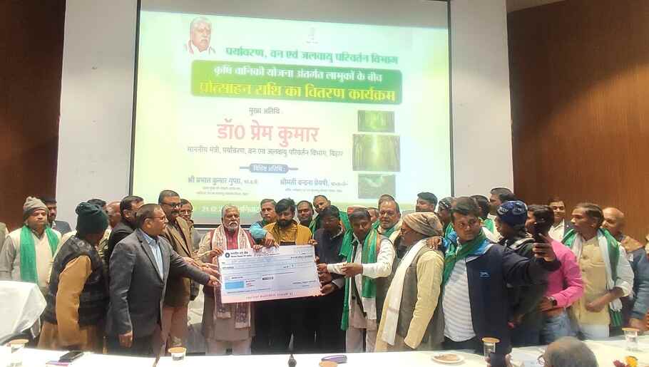 Bihar News: अरण्य भवन, पटना में बिहार के पर्यावरण, वन एवं जलवायु परिवर्तन विभाग के माननीय मंत्री डॉ० प्रेम कुमार द्वारा कृषि वानिकी योजना के लाभुकों के बीच प्रोत्साहन राशि का वितरण किया गया। इस अवसर पर वैशाली जिले के 08 कृषकों को ₹1.28 लाख, पटना जिले के 54 कृषकों को ₹4.28 लाख तथा भोजपुर जिले के 233 कृषकों को ₹17.09 लाख की राशि प्रदान की गई। राज्य के सभी जिलों में दिसम्बर, 2024 के महीने में योजना के तहत कुल ₹2 करोड़ से अधिक राशि का वितरण किया गया।