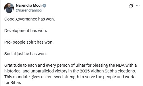 पीएम मोदी (PM Modi) ने सोशल मीडिया प्लेटफ़ॉर्म X पर लिखा, ‘बिहार में सुशासन की जीत हुई है। विकास की जीत हुई है। जनकल्याण की भावना की जीत हुई है। सामाजिक न्याय की जीत हुई है।’ उन्होंने कहा कि बिहार की जनता द्वारा मिले इस अभूतपूर्व समर्थन से सरकार को नए संकल्पों के साथ राज्य के उज्ज्वल भविष्य के लिए काम करने की प्रेरणा मिलेगी।