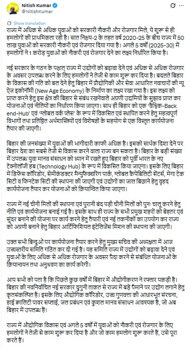 सीएम नीतीश कुमार (CM Nitish Kumar) ने अपने X पोस्ट में एक बार फिर ‘सात निश्चय’ की प्राथमिकताओं को सामने रखते हुए कहा कि युवाओं को नौकरी और रोजगार देना उनकी सरकार की सबसे बड़ी प्राथमिकता है। उन्होंने कहा कि सात निश्चय-2 के अंतर्गत 2020–25 के बीच 50 लाख युवाओं को रोजगार व सरकारी नौकरी मिली। अब अगले पांच वर्षों में इस संख्या को दोगुना करते हुए 1 करोड़ युवाओं को रोजगार देने की तैयारी है।