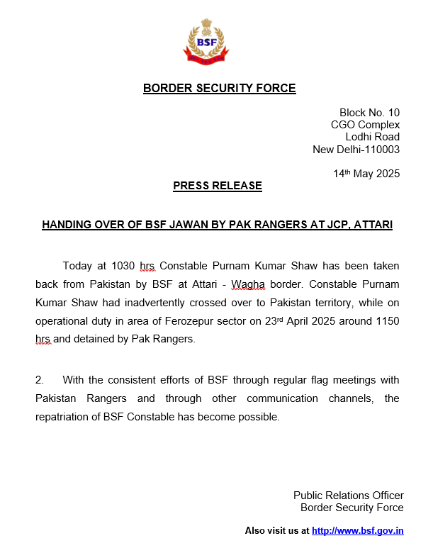BSF Jawan Return India: पाकिस्तान ने बीएसएफ जवान पूर्णम कुमार शॉ (BSF jawan Purnam Shaw) को भारत को सौंप दिया है। पाकिस्तानी रेंजर्स ने उन्हें अटारी-वाघा सीमा (Attari-Wagah Border) के रास्ते वापस भेजा। पूर्णम पिछले करीब 20 दिनों से पाकिस्तान की हिरासत में थे। वे 14 मई 2025 को सुबह 10:30 बजे वतन लौटे। बीएसएफ (BSF) उनसे पूछताछ कर रही है। पूर्णम शॉ (Purnam Shaw) 23 अप्रैल से लापता थे, जब वे पंजाब के फिरोजपुर सेक्टर में फसल कटाई की निगरानी के दौरान गलती से पाकिस्तान सीमा (Pakistan Border) में प्रवेश कर गए थे। इसके बाद पाक रेंजर्स ने उन्हें हिरासत में ले लिया था। पढ़िए पूरी खबर…
