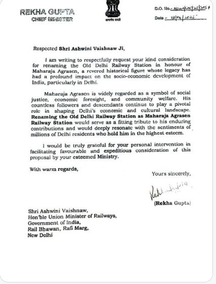 सीएम रेखा गुप्ता (CM Rekha Gupta) ने रेल मंत्री से इस प्रस्ताव पर शीघ्र और सकारात्मक विचार करने के लिए व्यक्तिगत हस्तक्षेप की मांग की। उन्होंने कहा कि यह कदम दिल्ली के निवासियों और महाराजा अग्रसेन के अनुयायियों के लिए गर्व का क्षण होगा।
