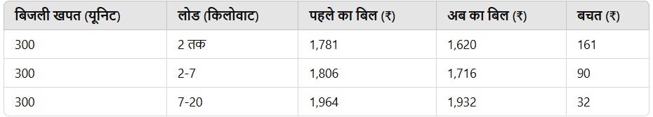 नए टैरिफ (New Tariff) के तहत, 301 यूनिट से अधिक बिजली खपत करने वालों को भी राहत दी गई है। पहले 301 यूनिट का बिल ₹1,788.75 आता था, जो अब घटकर ₹1,627.75 हो गया है। यानी उपभोक्ताओं को ₹161 की सीधी बचत होगी।