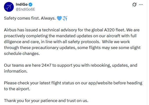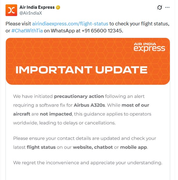 एयर इंडिया एक्सप्रेस ने कहा कि उसके 31 विमान इस तकनीकी दायरे में आते हैं। एयरलाइन ने सावधानी के तहत तुरंत सुधार प्रक्रिया शुरू कर दी है। एयर इंडिया ने भी स्पष्ट किया है कि उसके कुछ A320 फैमिली विमानों को सॉफ्टवेयर/हार्डवेयर रिअलाइनमेंट की जरूरत है, जिससे टर्नअराउंड टाइम बढ़ेगा और उड़ानों में देरी संभव है।