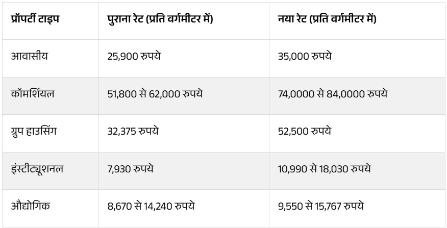 नई दरों के मुताबिक, आवासीय संपत्ति (Residential Property) की कीमत 35 हजार रुपये प्रति वर्गमीटर कर दी गई है। और औद्योगिक संपत्ति की दर 9,550 रुपये प्रति वर्गमीटर तय की गई है। वहीं कुछ श्रेणियों में संपत्ति दरों में 10 से 62 प्रतिशत तक की बढ़ोतरी हुई है।