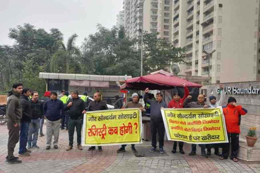 Greater Noida West: ग्रेटर नोएडा वेस्ट की गौड़ सिटी सोसाइटी (Gaur City Society) से बड़ी खबर निकल कर सामने आ रही है। आपको बता दें कि गौड़ सिटी के गौर सौंदर्यम सोसाइटी (Gaur Saundaryam Society) में जमकर बवाल हुआ। गौर सौंदर्यम सोसाइटी के निवासियों ने रविवार को बिल्डर की लापरवाही और लंबित रजिस्ट्रियों (Pending Registries) की समस्या को लेकर शांतिपूर्ण प्रदर्शन किया। इस प्रदर्शन के दौरान निवासियों ने अपनी नाराजगी जाहिर करते हुए कहा कि पूरी राशि के भुगतान के बाद भी उन्हें अब तक अपने फ्लैट (Flat) की रजिस्ट्री नहीं मिल पाई है।