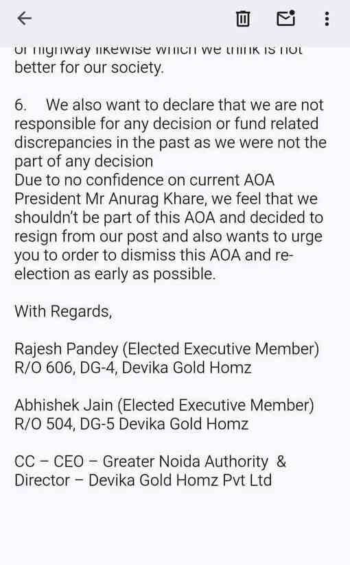 इस्तीफा देने वाले सदस्यों का कहना है कि जब चुनाव हुए थे, तो सदस्यता के नाम पर सोसाइटी के निवासियों से लाखों रुपये इकट्ठा किए गए थे। उन्होंने आरोप लगाया कि अध्यक्ष अनुराग खरे ने बिना किसी सदस्य की सहमति के उन पैसों को कोर्ट केस में खर्च करने का मंसूबा बनाया। इस कदम के कारण एओए के सदस्यों में रार पैदा हो गई। खासकर इस वक्त जब सोसाइटी की रजिस्ट्री प्रक्रिया ग्रेटर नोएडा में चल रही है, तो निवासियों को यह डर है कि कोर्ट के मामलों में फंसने के कारण उनकी रजिस्ट्री रुक सकती है।