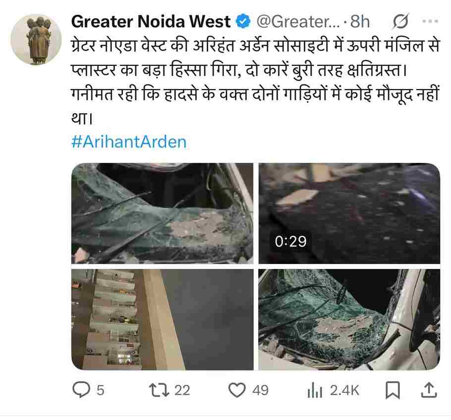 Greater Noida West: ग्रेटर नोएडा वेस्ट को यूं ही समस्याओं का शहर नहीं कहा जाता। यहां आए दिन किसी ना किसी सोसायटी में कुछ ना कुछ ऐसा होता रहता है जो सुर्खियां बनती है। ख़बर ग्रेटर नोएडा की पॉश सोसायटी (Posh Society) में से एक अरिहंत आर्डन(Arihant Arden) से आ रही है जहां देर शाम टावर की ऊपरी मंजिल के एक बड़े हिस्से का प्लास्टर कार पर गिर गया जिससे नीचे खड़ी दो कारें क्षतिग्रस्त हो गई। फर्ज कीजिए यही प्लास्ट अगर किसी व्यक्ति के ऊपर यह गिरा होता तो क्या होता। उसकी जान भी जा सकती थी।