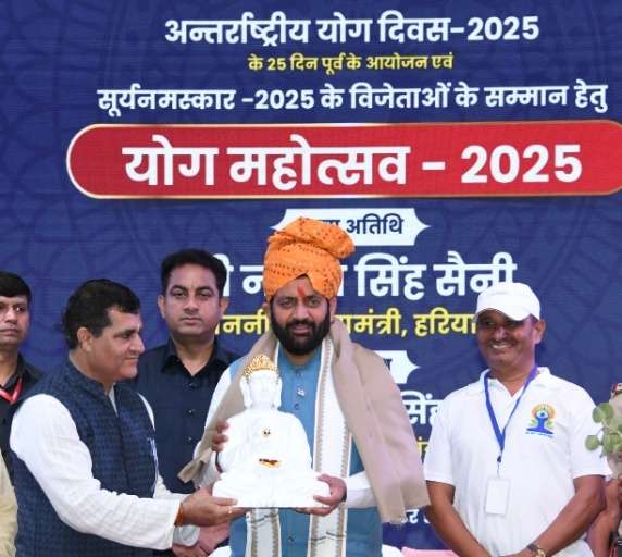 मुख्यमंत्री ने ये घोषणाएं आज पंचकूला में आयोजित भव्य योग महोत्सव के दौरान की। इससे पहले, मुख्यमंत्री ने विशेष रूप से ‘सूर्य नमस्कार अभियान 2025’ के 264 उत्कृष्ट प्रदर्शन करने वाले प्रतिभागियों को सम्मानित किया। इस मौके पर स्वास्थ्य एवं परिवार कल्याण और आयुष मंत्री कुमारी आरती सिंह राव भी उपस्थित रहीं।