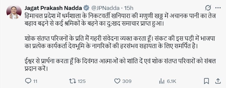 भाजपा राष्ट्रीय अध्यक्ष जे.पी. नड्डा ने हादसे पर शोक व्यक्त करते हुए कहा कि केंद्र और राज्य सरकार राहत और बचाव कार्यों के लिए हर संभव सहायता प्रदान कर रही है। उन्होंने सोशल मीडिया प्लेटफॉर्म X पर लिखा, ‘धर्मशाला के पास मनुनी खड्ड में श्रमिकों के बहने का दुखद समाचार प्राप्त हुआ। शोक संतप्त परिजनों के प्रति गहरी संवेदना व्यक्त करता हूं। भाजपा का प्रत्येक कार्यकर्ता हिमाचल के नागरिकों की सहायता के लिए समर्पित है।’
