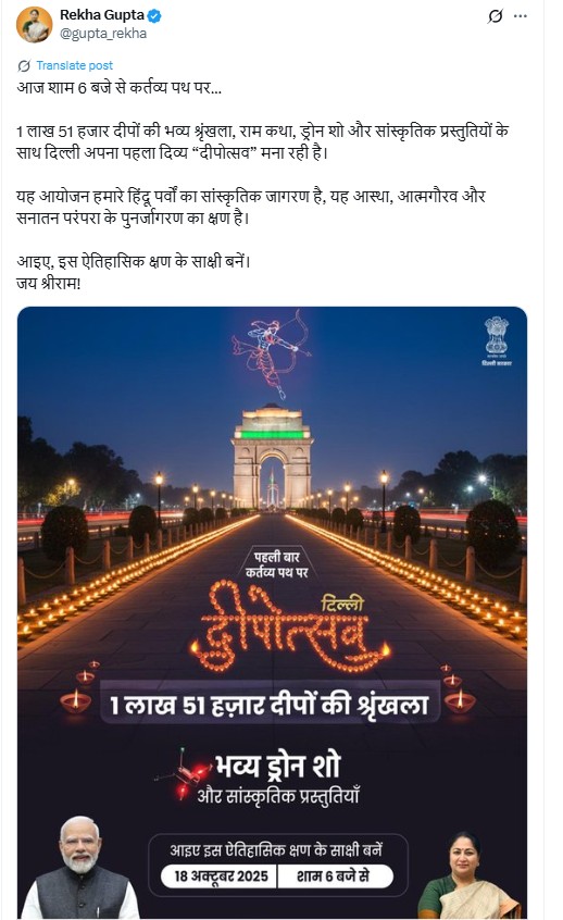 1 लाख 11 हजार दीपों की श्रृंखला, दिव्य राम कथा, भव्य ड्रोन शो और सांस्कृतिक प्रस्तुतियों के संग, दिल्ली अपना पहला दिव्य दीपोत्सव मना रही है। यह उस सनातन संस्कृति का प्रतीक है, जो युगों से यह संदेश देती आई है कि ‘राम थे, राम हैं, और राम रहेंगे।’ आइए, इस ऐतिहासिक क्षण के साक्षी बनें। 18 अक्टूबर, शाम 6 बजे से कर्तव्य पथ पर आप सभी का स्वागत है।’