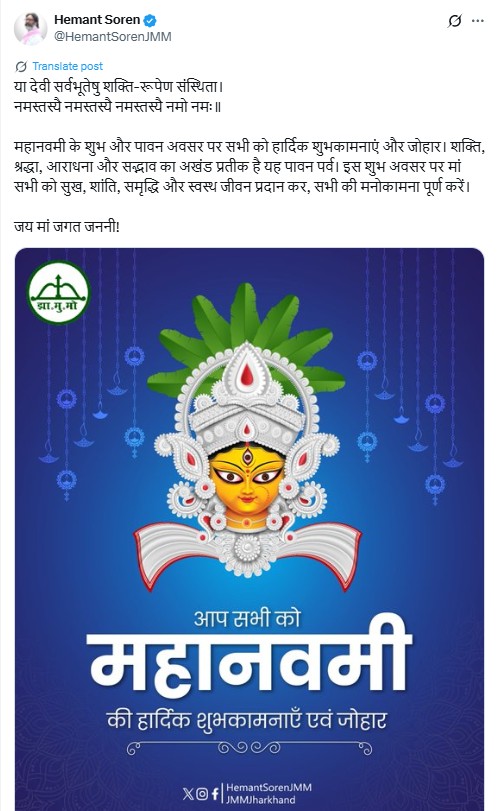 मुख्यमंत्री हेमंत सोरेन ने सोशल मीडिया प्लेटफॉर्म X पर अपने संदेश में लिखा, ‘या देवी सर्वभूतेषु शक्ति-रूपेण संस्थिता। नमस्तस्यै नमस्तस्यै नमस्तस्यै नमो नमः॥ महानवमी के शुभ और पावन अवसर पर सभी को हार्दिक शुभकामनाएं और जोहार।’ उन्होंने इस पर्व को शक्ति, श्रद्धा, आराधना और सद्भाव का प्रतीक बताया। सीएम ने आगे कहा, ‘इस शुभ अवसर पर मां सभी को सुख, शांति, समृद्धि और स्वस्थ जीवन प्रदान कर, सभी की मनोकामना पूर्ण करें। जय मां जगत जननी!’