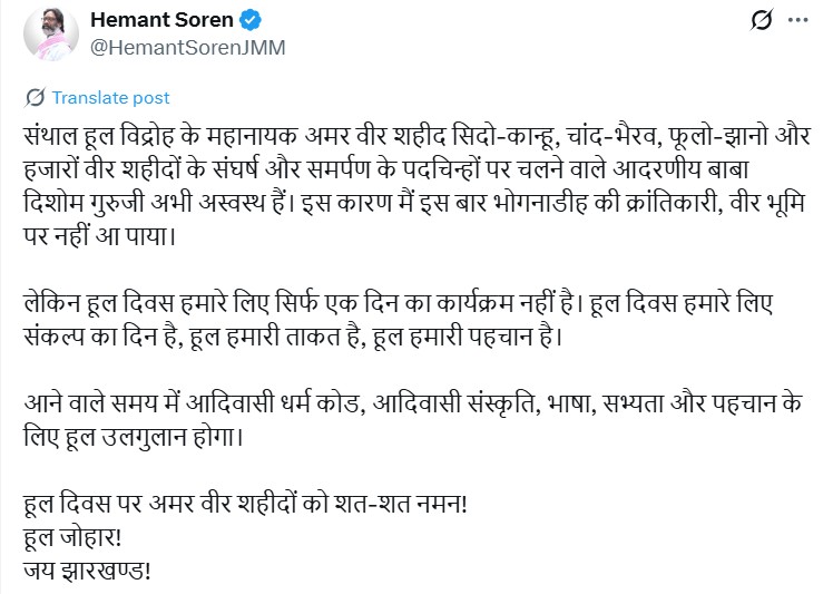 सीएम सोरेन ने X पर पोस्ट साझा करते हुए लिखा, ‘हूल दिवस हमारे लिए सिर्फ एक दिन का आयोजन नहीं, बल्कि संकल्प का दिन है। हूल हमारी ताकत और पहचान है। आने वाले समय में आदिवासी धर्म कोड, संस्कृति, भाषा, सभ्यता और पहचान के लिए हूल उलगुलान होगा।’ उन्होंने यह भी कहा कि यह दिवस झारखंड की सांस्कृतिक और ऐतिहासिक विरासत को मजबूत करने का प्रतीक है।