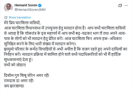 सीएम हेमंत सोरेन (CM Hemant Soren) ने घाटशिला वासियों से मतदान करने की अपील की है। सोशल मीडिया प्लेटफॉर्म X पर उन्होंने लिखा, ‘मेरे प्रिय घाटशिला वासियों, आज घाटशिला विधानसभा में उपचुनाव हेतु मतदान होना है। आप सभी घाटशिला वासियों से आग्रह है कि लोकतंत्र के इस महापर्व में आप सभी बढ़-चढकर भाग लें तथा अपने आस-पास के लोगों को भी मतदान हेतु प्रेरित करें। आज घाटशिला फिर अपना हक-अधिकार सुनिश्चित करने के लिए भारी संख्या में मतदान करेगा।