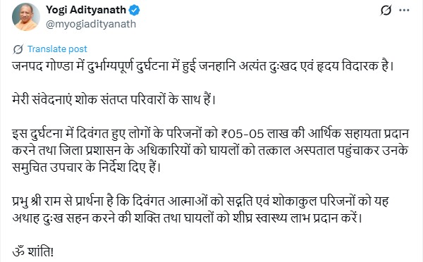 सीएम योगी आदित्यनाथ (CM Yogi Adityanath) ने हादसे पर गहरा शोक व्यक्त किया है। उन्होंने X पर लिखा, ‘जनपद गोंडा में दुर्भाग्यपूर्ण दुर्घटना में हुई जनहानि अत्यंत दुःखद और हृदय विदारक है। मेरी संवेदनाएं शोक संतप्त परिवारों के साथ हैं। इस दुर्घटना में दिवंगत हुए लोगों के परिजनों को 5-5 लाख रुपये की आर्थिक सहायता प्रदान करने और जिला प्रशासन को घायलों के समुचित इलाज के निर्देश दिए गए हैं। प्रभु श्री राम से प्रार्थना है कि दिवंगत आत्माओं को सद्गति और शोकाकुल परिजनों को यह दुख सहन करने की शक्ति प्रदान करें।’