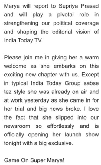 इंडिया टुडे ग्रुप की Vice Chairperson कली पुरी ने बेहतरीन अंदाज़ में मारिया शकील का स्वागत किया और उन्हें भविष्य के लिए बधाई भी दी है।