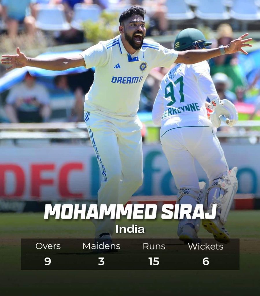 Team India: भारतीय टीम के तेज गेंदबाज मोहम्मद सिराज (Mohammad Siraj) ने साउथ अफ्रीका (South Africa) के केपटाउन में वो कारनामा रच दिया जो आज से पहले वहां किसी गेंदबाज ने नहीं किया था। टेस्ट सीरीज (Test Series) के दूसरे मैच में साउथ अफ्रीका ने जब टॉस जीतकर बैटिंग करने का निर्णय लिया तो उसे भी नहीं पता था आज केपटाउन में मियां मैजिक नाम का तूफान कहर बनकर टूट पड़ेगा और पूरी टीम को तहस नहस कर के रख देगा।