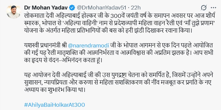 सीएम डॉ. मोहन यादव (CM Dr. Mohan Yadav) ने सोशल मीडिया के माध्यम से नारीशक्ति की झलक साझा करते हुए कहा, ‘यह आयोजन देवी अहिल्याबाई होल्कर जी की युगद्रष्टा चेतना को समर्पित है, जिन्होंने अपने सुशासन, न्यायप्रियता और करुणा से महिला सशक्तिकरण की नींव रखी।’ उन्होंने कहा कि यह रैली आत्मविश्वास और प्रगति की दिशा में नारीशक्ति के दृढ़ संकल्प का प्रतीक है।