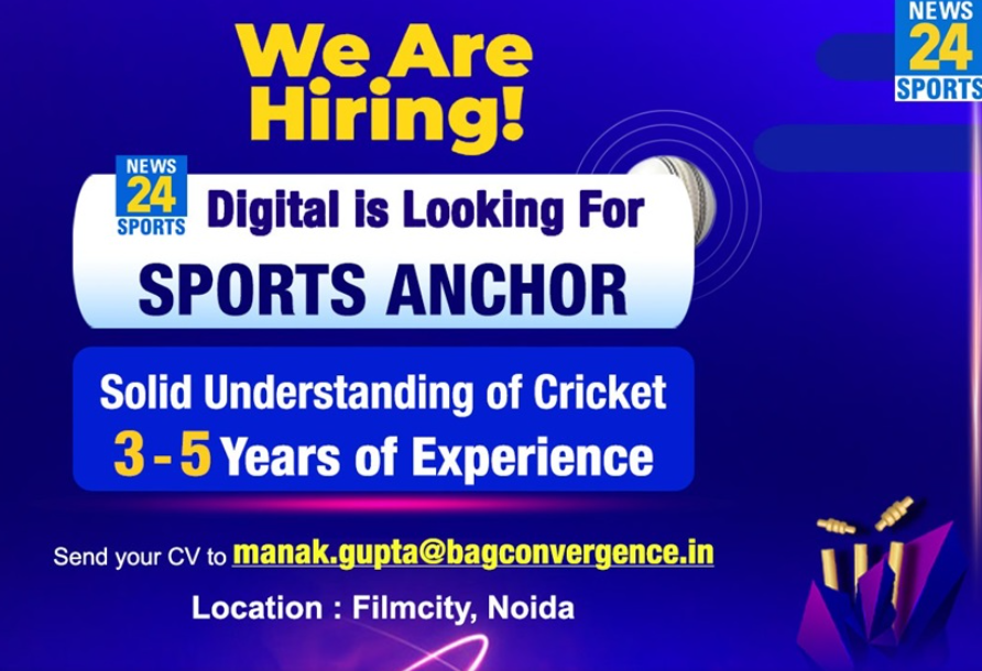 नेशनल हिंदी चैनल न्यूज24(News24) को एक ऐसे स्पोर्ट्स एंकर(Sports Anchor) की तलाश है जो क्रिकेट का ज्ञान रखता/रखती हो। यह वैकेंसी न्यूज24 के डिजिटल प्लेटफार्म के लिए है। जिसके लिए 3-5 साल का अनुभव जरूरी है। भर्ती नोएडा ऑफिस के लिए की जा रही है। कैंडिडेट के पास संबंधित क्षेत्र में काम करने का 3-5 वर्ष का अनुभव होना जरूरी है. अपना रिज्युमे manak.gupta@bagconvergence.in पर भेजकर अप्लाई कर सकते हैं.