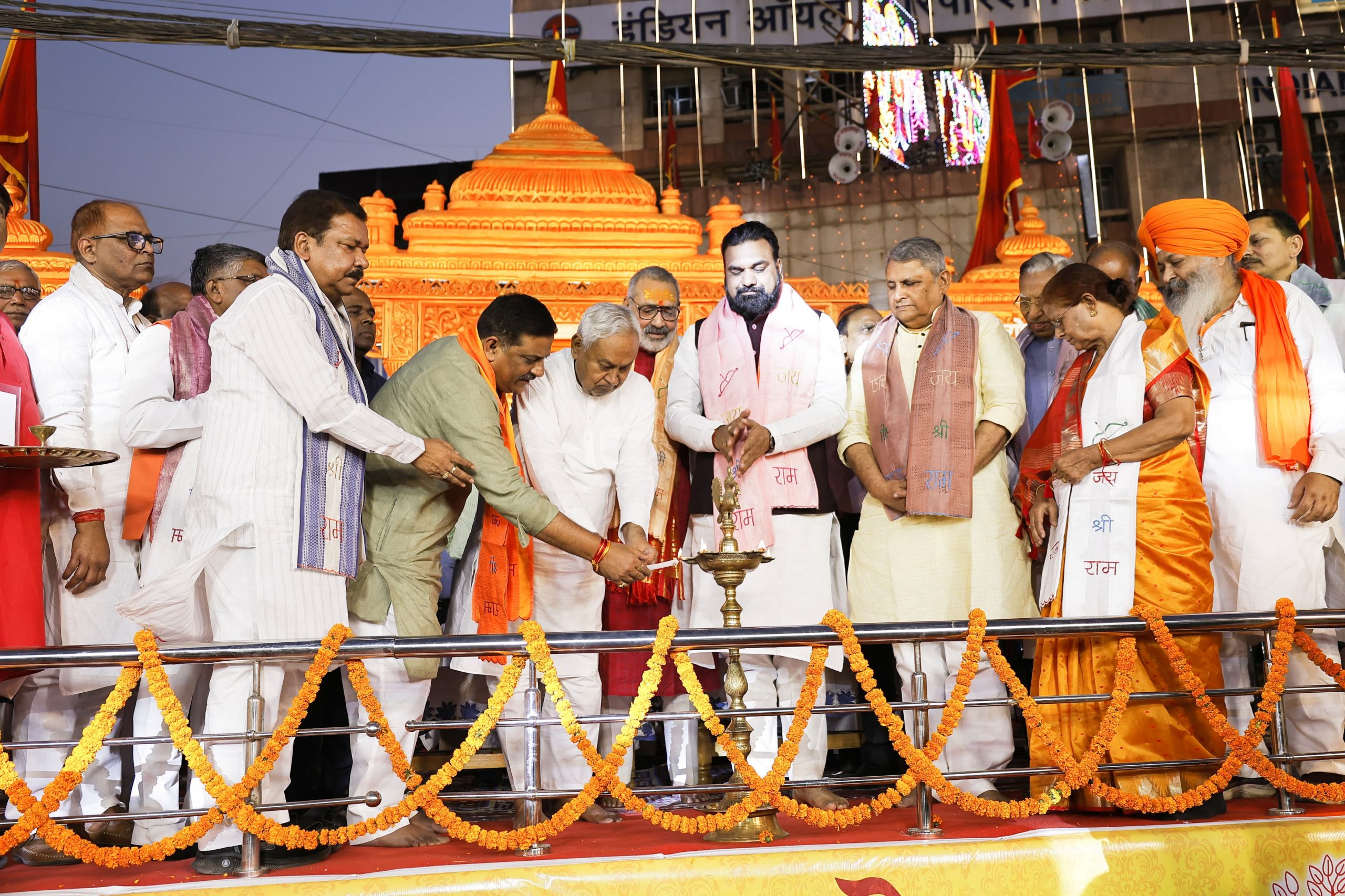 Patna News: मुख्यमंत्री नीतीश कुमार आज शाम श्री रामनवमी के अवसर पर पटना के डाकबंगला चौराहा पर श्री श्री रामनवमी शोभा यात्रा अभिनन्दन समिति द्वारा आयोजित कार्यक्रम में शामिल हुये। मुख्यमंत्री ने शोभा यात्रा का स्वागत कर आरती की तथा उन्हें प्रतीक चिह्न भेंटकर सम्मानित किया।