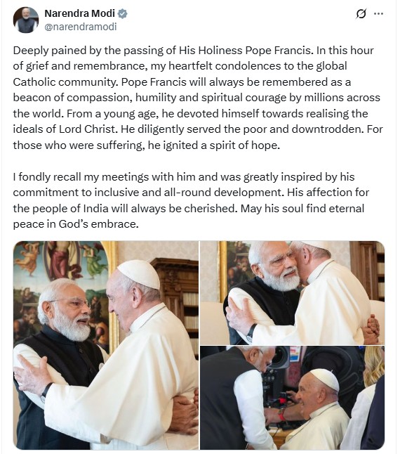पीएम नरेंद्र मोदी ने पोप फ्रांसिस को श्रद्धांजलि अर्पित की है। PM मोदी ने ‘X’ पर लिखा-परम पूज्य पोप फ्रांसिस के निधन से मुझे गहरा दुख हुआ है। दुख और स्मरण की इस घड़ी में, वैश्विक कैथोलिक समुदाय के प्रति मेरी हार्दिक संवेदनाएं। पोप फ्रांसिस को दुनिया भर के लाखों लोग हमेशा करुणा, विनम्रता और आध्यात्मिक साहस के प्रतीक के रूप में याद रखेंगे। छोटी उम्र से ही उन्होंने प्रभु ईसा मसीह के आदर्शों को साकार करने के लिए खुद को समर्पित कर दिया था। उन्होंने गरीबों और वंचितों की लगन से सेवा की। जो लोग पीड़ित थे, उनके लिए उन्होंने आशा की भावना जगाई।