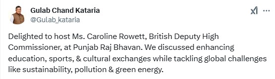 Punjab की राजधानी चंडीगढ़ में ब्रिटिश उप उच्चायुक्त कैरोलीन रोवेट ने पंजाब के गवर्नर गुलाब चंद कटारिया से मुलाकात की।