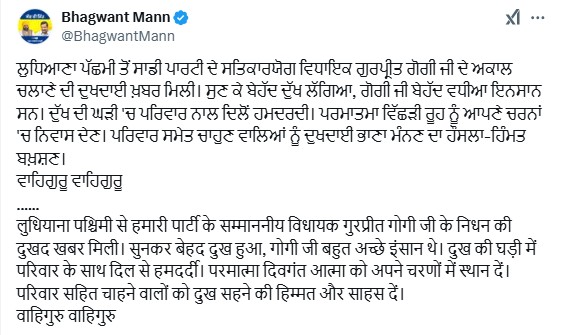 पंजाब के सीएम भगवंत मान (CM Bhagwant Mann) ने लुधियाना पश्चिमी से आम आदमी पार्टी (AAP) के विधायक गुरप्रीत गोगी के निधन पर गहरा दुख व्यक्त किया है। सीएम मान ने सोशल मीडिया प्लेटफॉर्म X पर अपने शोक संदेश में कहा, “लुधियाना पश्चिमी से हमारी पार्टी के सम्माननीय विधायक गुरप्रीत गोगी जी के निधन की दुखद खबर मिली। सुनकर बेहद दुख हुआ, गोगी जी बहुत अच्छे इंसान थे।”