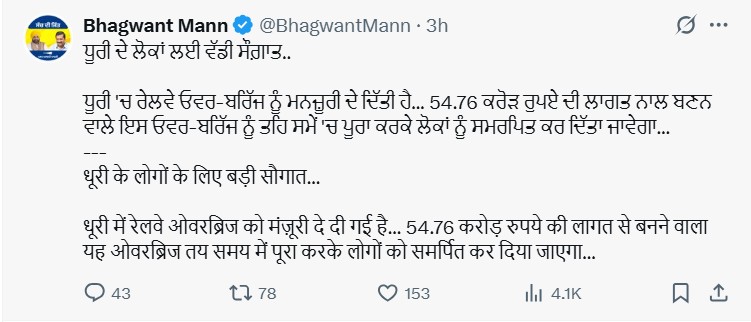 सीएम भगवंत सिंह मान (CM Bhagwant Singh Mann) ने सोशल मीडिया प्लेटफॉर्म ‘X’ पर जानकारी साझा करते हुए कहा, ‘धुरी के लोगों के लिए तोहफा! धुरी (Dhuri) में रेलवे ओवरब्रिज को मंजूरी मिल गई है। 54.76 करोड़ रुपये की लागत से बनने वाला यह पुल तय समय में पूरा कर लोगों को समर्पित किया जाएगा।’