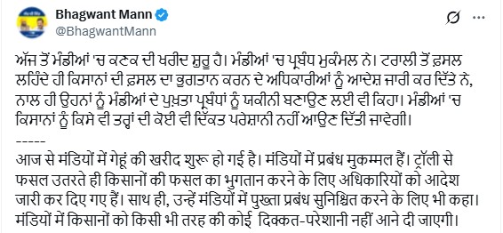 सीएम भगवंत मान (CM Bhagwant Mann) ने सोशल मीडिया प्लेटफॉर्म X पर लिखा कि आज से राज्यभर की मंडियों में गेहूं की खरीद शुरू हो गई है। मंडियों में सभी आवश्यक प्रबंध पूरी तरह मुकम्मल हैं। ट्रॉली से फसल उतरते ही किसानों (Farmer) को भुगतान सुनिश्चित करने के लिए अधिकारियों को सख्त निर्देश दिए गए हैं। साथ ही, मंडियों में सभी व्यवस्थाएं सुचारू रूप से संचालित करने के लिए भी कहा गया है। सरकार यह सुनिश्चित करेगी कि किसानों को किसी भी तरह की दिक्कत या परेशानी न हो।