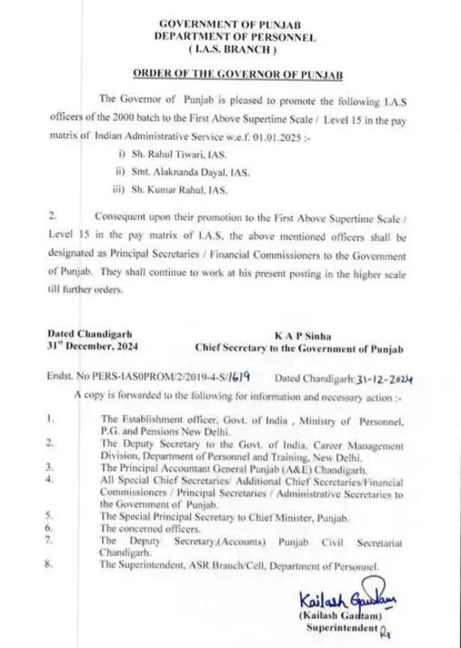 आपको बता दें कि पंजाब सरकार (Punjab Government) ने साल 2000 बैच के तीन आईएएस अधिकारियों को प्रमुख सचिव और वित्त आयुक्त (Finance Commissioner) के पद पर पदोन्नति दी है। इनमें राहुल तिवारी, अलकनंदा दयाल और कुमार राहुल का नाम शामिल है। यह आदेश मंगलवार शाम को जारी किए गए।