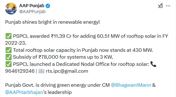 बिजली मंत्री हरभजन सिंह ईटीओ (Minister Harbhajan Singh ETO) ने राज्य के घरेलू उपभोक्ताओं से अपील करते हुए कहा कि वे सभी अपने घर पर रूफटॉप सोलर सिस्टम स्थापित करें। इससे उन्हें पहले 2 किलोवाट के लिए 30,000 रुपये प्रति किलोवाट और 2 किलोवाट से 3 किलोवाट तक 18,000 रुपये प्रति किलोवाट की सब्सिडी का लाभ मिलेगा।