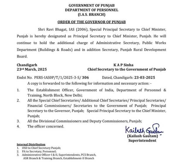 Punjab News: पंजाब के सीएम भगवंत मान (CM Bhagwant Mann) को नया प्रधान सचिव मिल गया है। पंजाब सरकार ने आईएएस अधिकारी रवि भगत (Ravi Bhagat) को मुख्यमंत्री भगवंत मान का प्रधान सचिव (Secretary General) नियुक्त किया है। फिलहाल, रवि भगत सीएम भगवंत मान के स्पेशल प्रिंसिपल सेक्रेटरी के रूप में कार्यरत थे। इससे पहले, एडीजीपी गौरव यादव मुख्यमंत्री के स्पेशल प्रिंसिपल सेक्रेटरी थे। गौरव यादव 1992 बैच के आईपीएस अधिकारी हैं, और उन्होंने सीएम मान के पदभार संभालने के तुरंत बाद यह जिम्मेदारी ली थी। पढ़िए पूरी खबर…