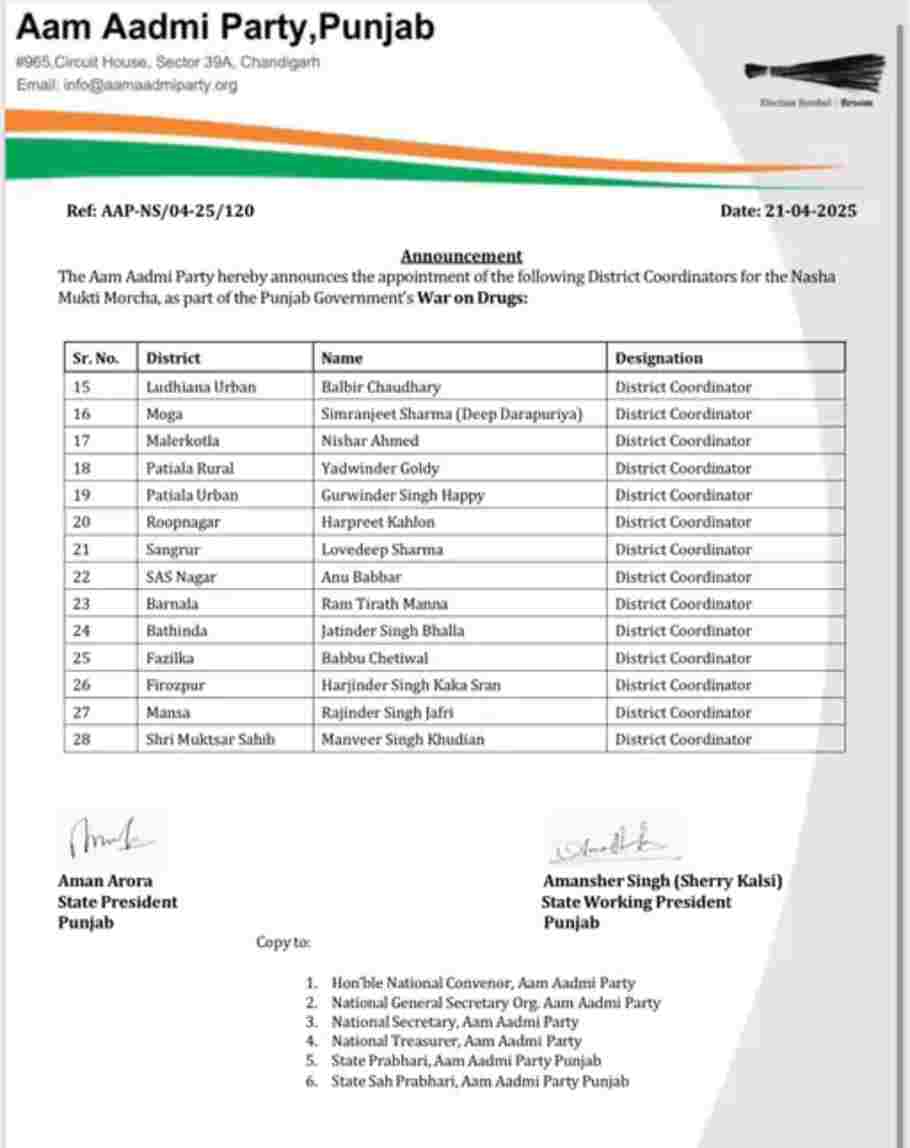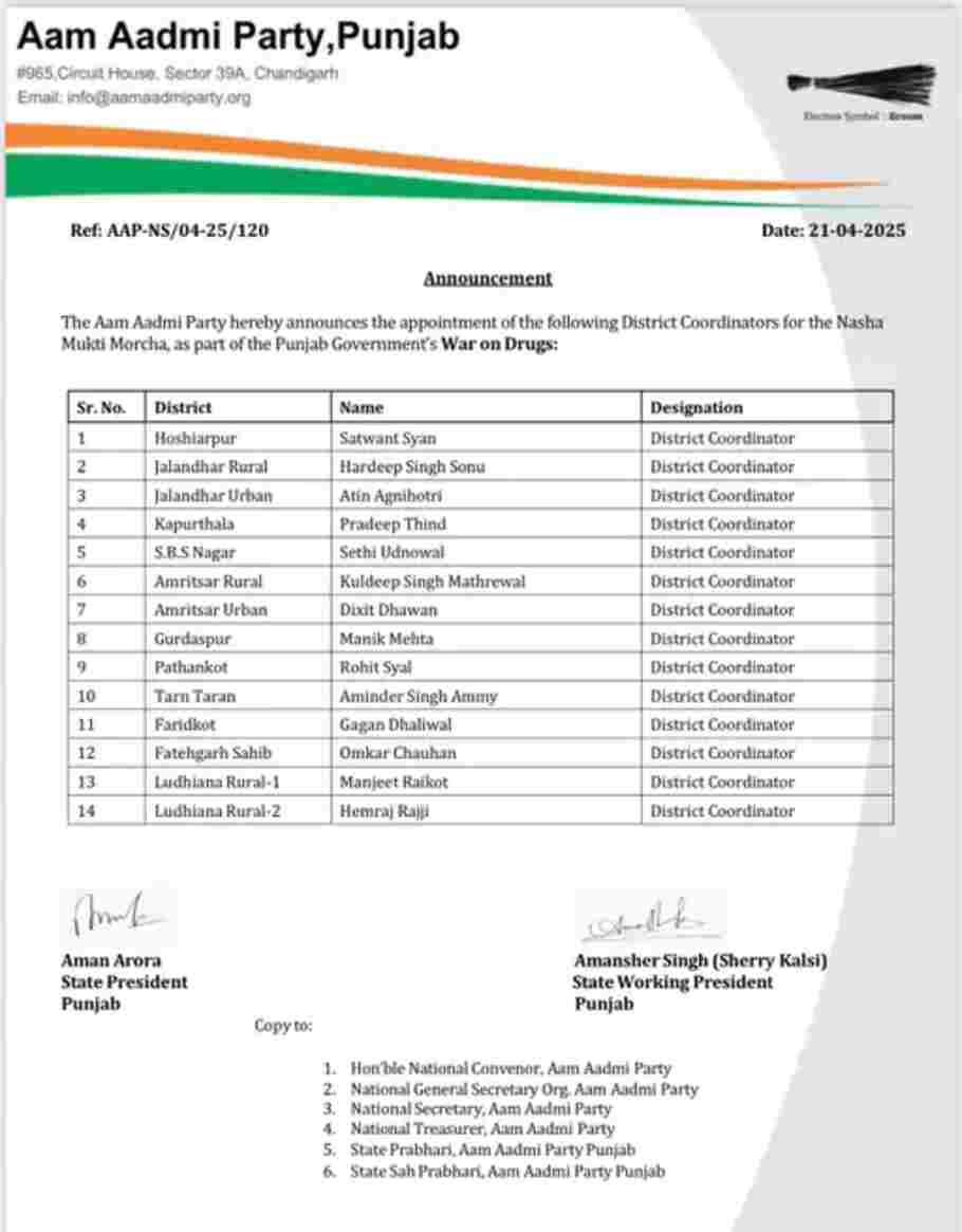Punjab News: पंजाब में नशे की समस्या काफी समय से एक गंभीर सामाजिक चुनौती बनी हुई थी। युवाओं का भविष्य बर्बाद कर रहे इस जहर के खिलाफ पंजाब की भगवंत सिंह मान सरकार (Bhagwant Mann Sarkar) ने निर्णायक जंग छेड़ दी है। नशा तस्करों (Drug Smugglers) पर सख्त कार्रवाई के साथ-साथ अब मान सरकार ने नशा पीड़ितों को इलाज और पुनर्वास की दिशा में बड़ा कदम उठाया है। नशा छुड़ाओ मोर्चा के तहत शुरू की गई इस मुहिम को हर जिले तक पहुंचाने के लिए भगवंत मान सरकार (Bhagwant Mann Sarkar) ने सभी जिलों में कोऑर्डिनेटर (Coordinator) नियुक्त किए हैं, जो स्थानीय स्तर पर जागरूकता फैलाने और नशे को लेकर बीमार लोगों के इलाज के लिए अहम भूमिका निभाएंगे। पंजाब के मुख्यमंत्री भगवंत सिंह मान (CM Bhagwant Singh Mann) ने नशा के खिलाफ एक नया नारा दिया है “नशा हारेगा, पंजाब जीतेगा।” इसके साथ ही, आम आदमी पार्टी (Aam Aadmi Party) ने नशा मुक्ति मोर्चा के लिए सभी जिलों में कोऑर्डिनेटर नियुक्त कर उन्हें पंजाब को नशा मुक्त बनाने में अहम योदगान देने की अपील की है।