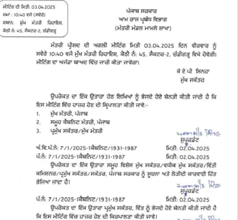 पंजाब कैबिनेट की मीटिंग बारे पत्र