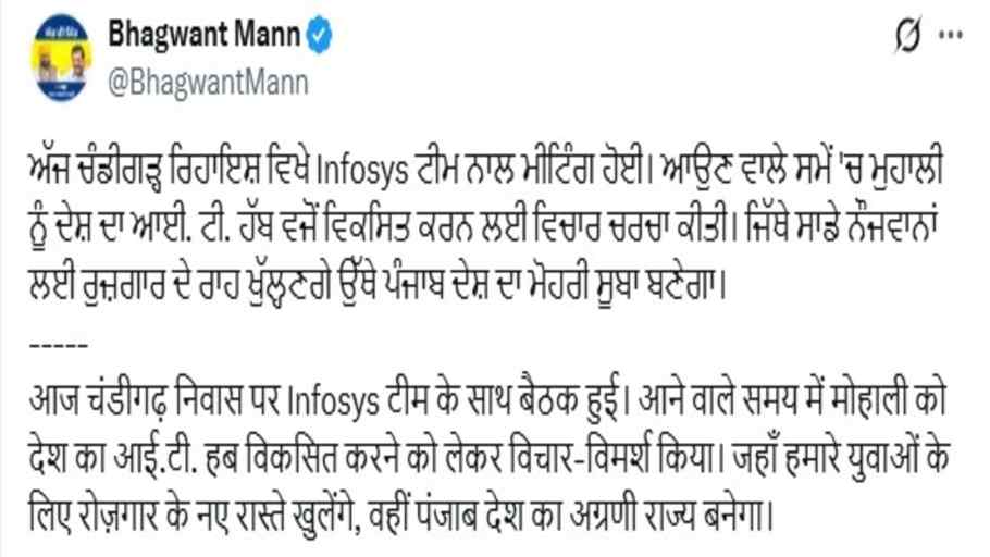 Punjab News: पंजाब के सीएम भगवंत मान (CM Bhagwant Mann) ने अपने चंडीगढ़ स्थित निवास पर आईटी क्षेत्र की दिग्गज कंपनी इंफोसिस के अधिकारियों के साथ अहम बैठक की। इस दौरान मोहाली को देश के नए आईटी हब (New IT Hubs) के रूप में विकसित करने की दिशा में विस्तार से चर्चा की गई। सीएम मान ने इस बैठक की तस्वीरें अपने X हैंडल पर साझा करते हुए लिखा कि मोहाली को आईटी सेक्टर (IT Sector) में आगे बढ़ाने से न केवल पंजाब के युवाओं के लिए रोजगार के नए रास्ते खुलेंगे, बल्कि पंजाब देश के अग्रणी राज्यों में शुमार होगा।