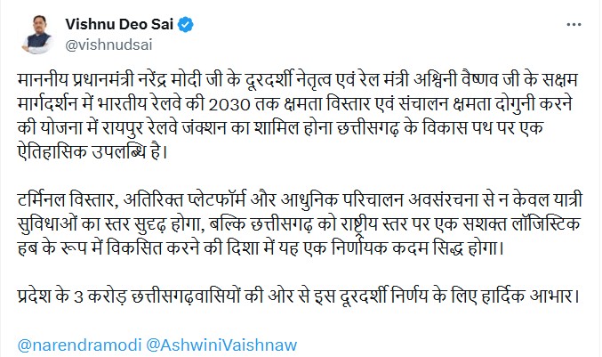मुख्यमंत्री विष्णु देव साय ने कहा – यह निर्णय छत्तीसगढ़ के यात्रियों के लिए बड़ा तोहफ़ा, कनेक्टिविटी और आर्थिक गतिविधियाँ होंगी सुदृढ़