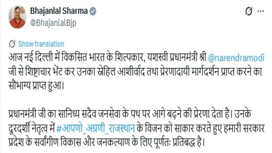 सीएम भजनलाल शर्मा (CM Bhajanlal Sharma) ने सोशल मीडिया प्लेटफॉर्म X पर लिखा, ‘आज नई दिल्ली में विकसित भारत के शिल्पकार, प्रधानमंत्री नरेंद्र मोदी से शिष्टाचार भेंट कर उनका स्नेहिल आशीर्वाद और प्रेरणादायी मार्गदर्शन प्राप्त करने का सौभाग्य मिला।’