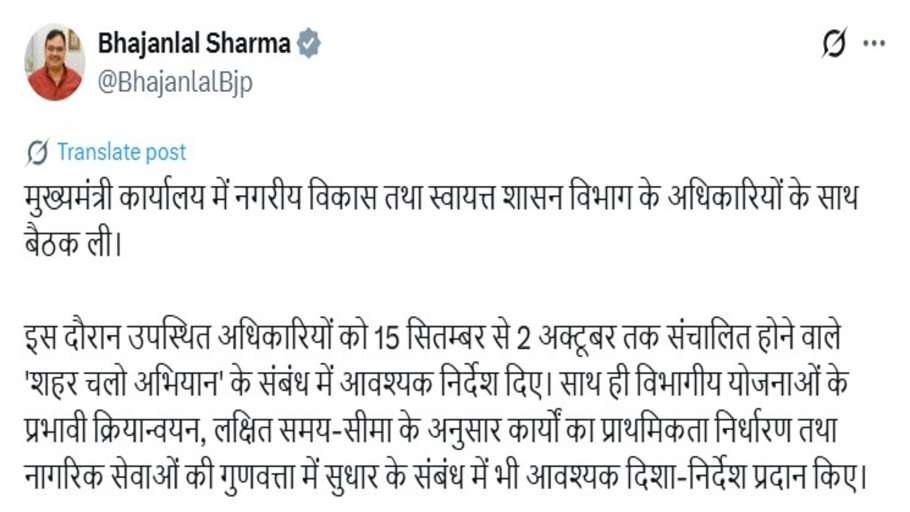 सीएम भजनलाल शर्मा (CM Bhajanlal Sharma) ने कहा कि राज्य सरकार का प्रमुख ध्येय अंत्योदय की संकल्पना को सिद्धि की ओर ले जाते हुए अंतिम छोर के व्यक्ति को राहत पहुंचाना है। इसी दिशा में 15 सितम्बर से 2 अक्टूबर तक ‘शहर चलो अभियान’ संचालित किया जाएगा, जो जनता की सुविधा सुनिश्चित करने में मील का पत्थर साबित होगा। उन्होंने अधिकारियों से कहा कि अभियान के सफल संचालन के लिए ठोस कार्ययोजना बनाई जाए।