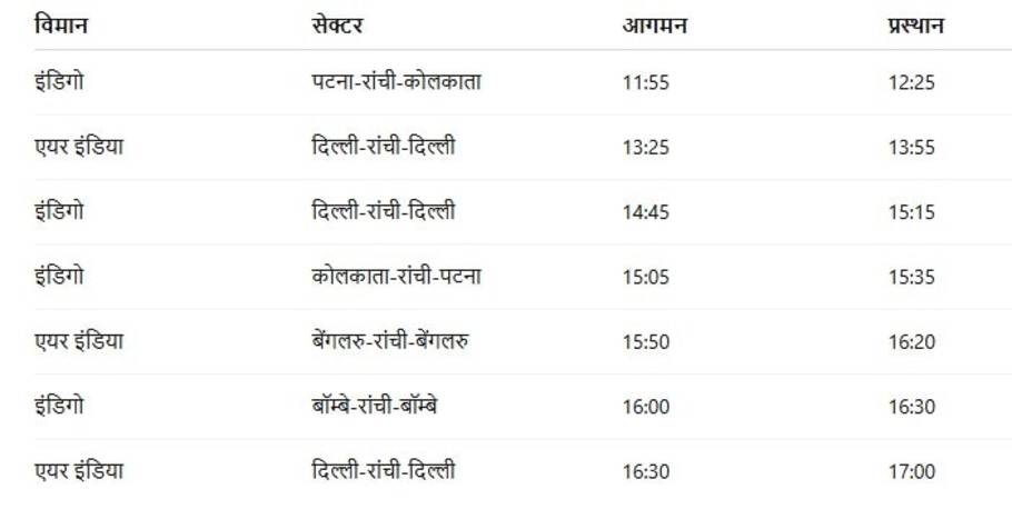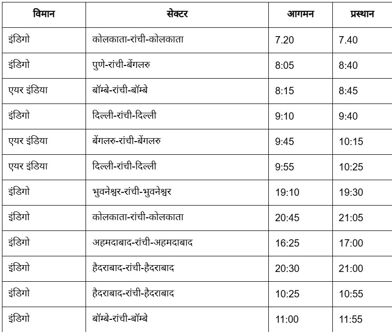 नए शेड्यूल (New Schedules) के मुताबिक, रांची से दिल्ली के लिए प्रतिदिन 7 सीधी उड़ानें उपलब्ध हैं, जबकि बेंगलुरु के लिए 4 सीधी उड़ानें संचालित हो रही हैं। इसके अलावा, मुंबई और कोलकाता के लिए 3-3 उड़ानें हैं। हैदराबाद के लिए 2 उड़ानें प्रतिदिन उपलब्ध हैं, जबकि पटना, अहमदाबाद, भुवनेश्वर, चेन्नई और पुणे के लिए रोजाना एक-एक उड़ान संचालित हो रही है। यह शेड्यूल यात्रियों को प्रमुख शहरों तक आसान पहुंच प्रदान करता है।
