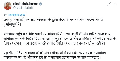 घटना की जानकारी मिलते ही सीएम भजनलाल शर्मा (CM Bhajanlal Sharma) देर रात ही अस्पताल पहुंचे और स्थिति का जायजा लिया। उन्होंने अधिकारियों को त्वरित कार्रवाई के निर्देश दिए और फोन पर लगातार अपडेट लेते रहे। सीएम के साथ चिकित्सा शिक्षा सचिव अंबरीश कुमार, पुलिस कमिश्नर बीजू जॉर्ज जोसेफ, कलेक्टर जितेंद्र सोनी, और SMS मेडिकल कॉलेज के प्राचार्य डॉ. दीपक माहेश्वरी भी मौजूद रहे।
