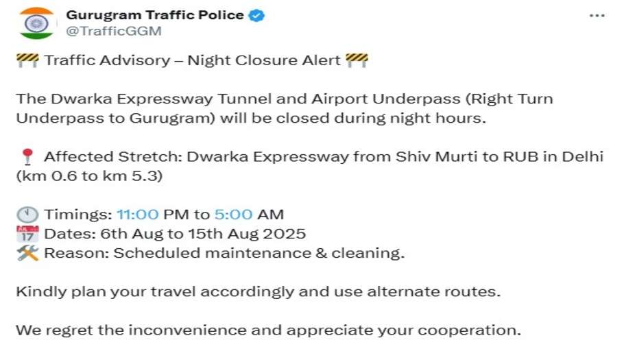 Traffic Advisory: दिल्ली से गुरुग्राम की ओर यात्रा करने वाले लोगों (People) के लिए एक अहम जानकारी सामने आई है। द्वारका एक्सप्रेसवे सुरंग (Dwarka Expressway Tunnel) और एयरपोर्ट अंडरपास (Airport Underpass) पर मरम्मत कार्य के चलते यह मार्ग अगले 1 हफ्ते तक बंद रहेगा। ट्रैफिक पुलिस (Traffic Police) ने यात्रियों को वैकल्पिक मार्गों का उपयोग करने की सलाह दी है जिससे किसी भी असुविधा से बचा जा सके। पढ़िए पूरी खबर…
