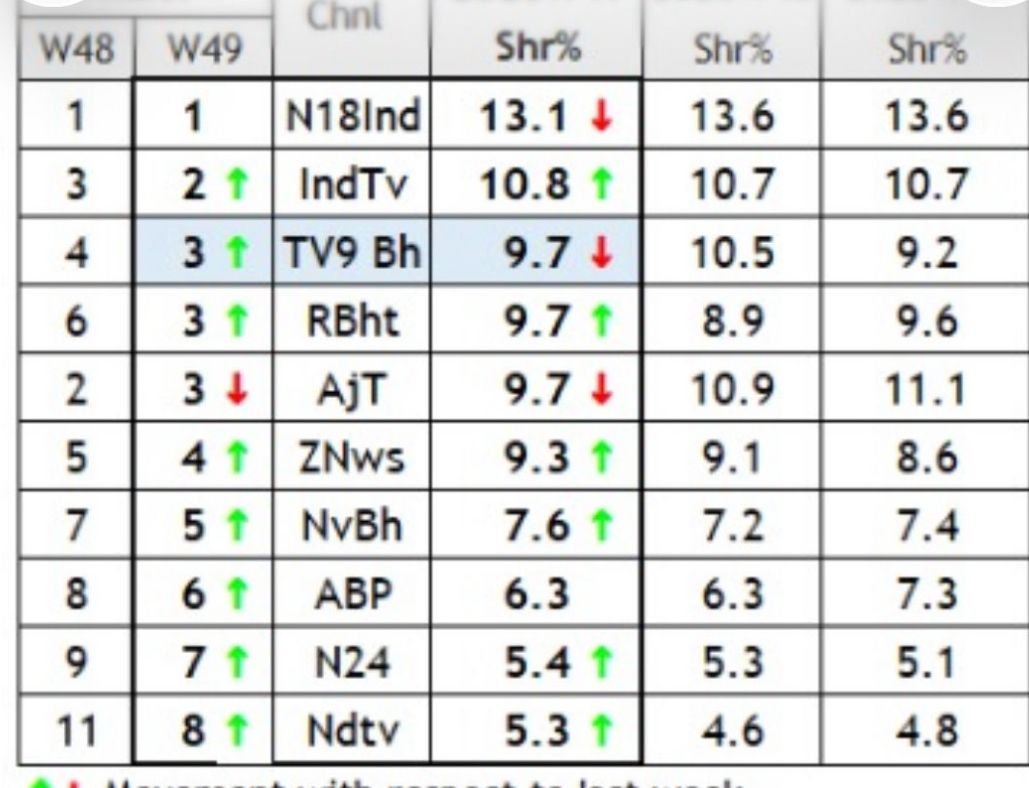 TRP News: जिस टीआरपी का दर्शकों को लंबे समय से इंतज़ार था, वह अब सामने आ चुकी है। ताज़ा आंकड़ों के मुताबिक़, न्यूज़18 इंडिया (News18 India) एक बार फिर नंबर-1 की पोज़िशन पर काबिज़ है। दूसरे नंबर पर इंडिया टीवी (India TV) ने शानदार उछाल के साथ अपनी जगह बनाई है। तीसरे स्थान पर टीवी9 भारतवर्ष (TV9 Bharatvarsh), रिपब्लिक भारत (Republic Bharat) और आज तक (AajTak) तीनों चैनल मौजूद हैं। वहीं ज़ी न्यूज़ (Zee News) चौथे नंबर पर बना हुआ है। बाकी चैनलों की टीआरपी इस प्रकार है।