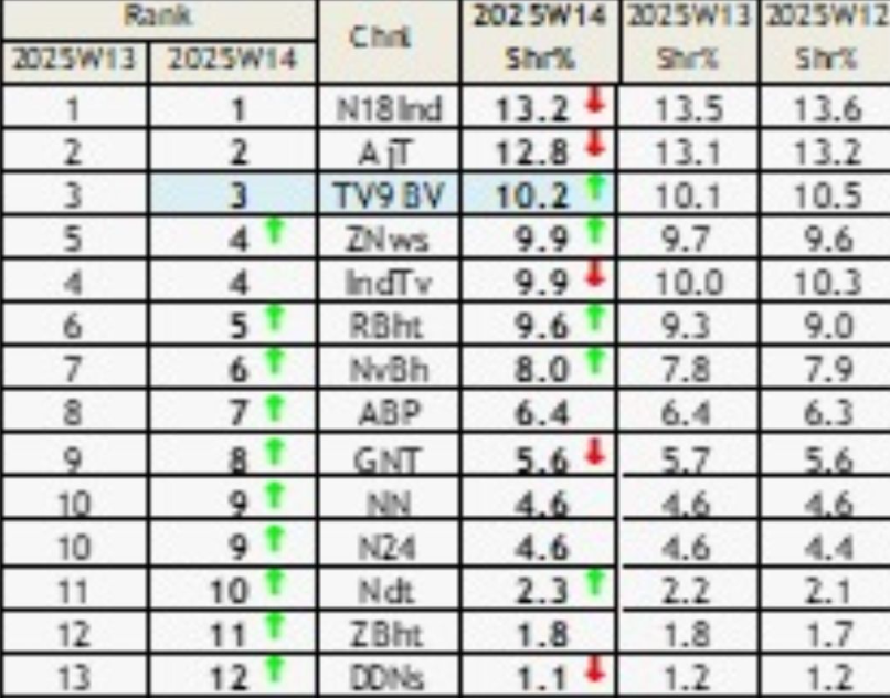 TRP News: टीआरपी की ताजा रैंकिंग लिस्ट आ चुकी है। इस बार टॉप 10 में कई जगह बदलाव दिख रहा है। हालांकि इन सबके बीच न्यूज18 इंडिया (News18 India) ने नंबर वन की कुर्सी बरकरार रखी है। आज तक (AajTak) दूसरे नंबर पर है। वहीं टीवी9 भारतवर्ष (Tv9 Bharatvarsh) तीसरे नंबर पर काबिज है। चौथे नंबर की गद्दी पर विराजमान इंडिया टीवी( India TV) फिसलकर 5वें नंबर पर जा पहुंचा है। इंडिया टीवी की गद्दी ज़ी न्यूज़ (Zee News) ने हथिया ली है। बाकी चैनलों की टीआरपी इस प्रकार है….