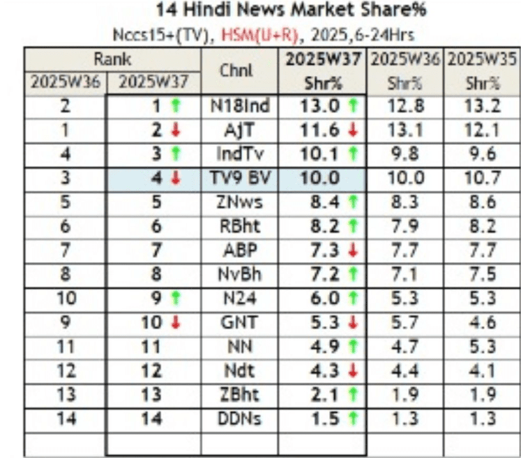 नुकसान होने की वजह से आजतक (AajTak) नंबर 2 पर चला गया है। तीसरे नंबर पर बड़ा उलटफेर हुआ है। इंडिया टीवी(India Tv) ने टीवी9 भारतवर्ष से नंबर3 की गद्दी छीन ली है। इस तरह टीवी9 भारतवर्ष नंबर4 पर पहुंच गया है। पांचवें नंबर पर ज़ी न्यूज़ (Zee News) जबकि रिपब्लिक भारत (Republic Bharat) फिलहाल छठे नंबर पर है। बाकी चैनलों की टीआरपी इस प्रकार है।