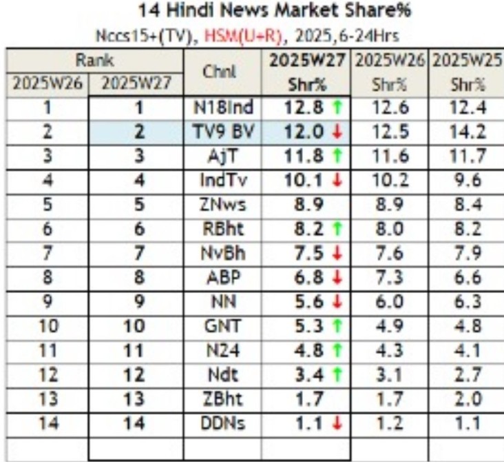 TRP News: TRP का इंतजार खत्म हुआ। पहले नंबर पर न्यूज़18 इंडिया (News18 India) की बादशाहत बरकरार है। दूसरे नंबर पर टीवी9 भारतवर्ष अपना झंडा बुलंद किए हुए है। जबकि आजतक (AajTak) को फिलहाल तीसरे नंबर से ही संतोष करना पड़ रहा है। चौथे नंबर पर इंडिया टीवी जबकि पांचवें नंबर पर ज़ी न्यूज़ है। बाकी चैनलों की टीआरपी इस तरह है–
