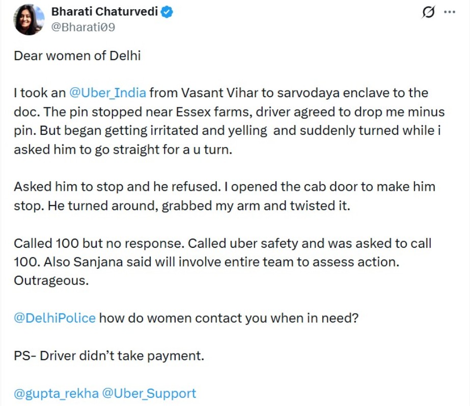महिला ने एक्स पर @DelhiPolice को टैग कर सवाल उठाया, ‘जरूरत पड़ने पर दिल्ली की महिलाएं आपसे कैसे संपर्क करें?’ इस घटना ने महिला सुरक्षा और राइड-हेलिंग ऐप्स की जिम्मेदारी पर फिर से चर्चा छेड़ दी है।
