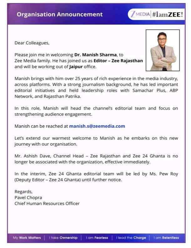 Zee Media: राजस्थान टीवी मीडिया के प्रतिष्ठित नाम मनीष शर्मा (Manish Sharma) ने अब ज़ी मीडिया समूह का दामन थाम लिया है। वे जी मीडिया (Zee Media) के राजस्थान चैनल जी राजस्थान में चैनल हेड (Channel Head) की जिम्मेदारी संभालेंगे। इस बड़ी नियुक्ति के बाद राज्य के मीडिया जगत में हलचल मच गई है।